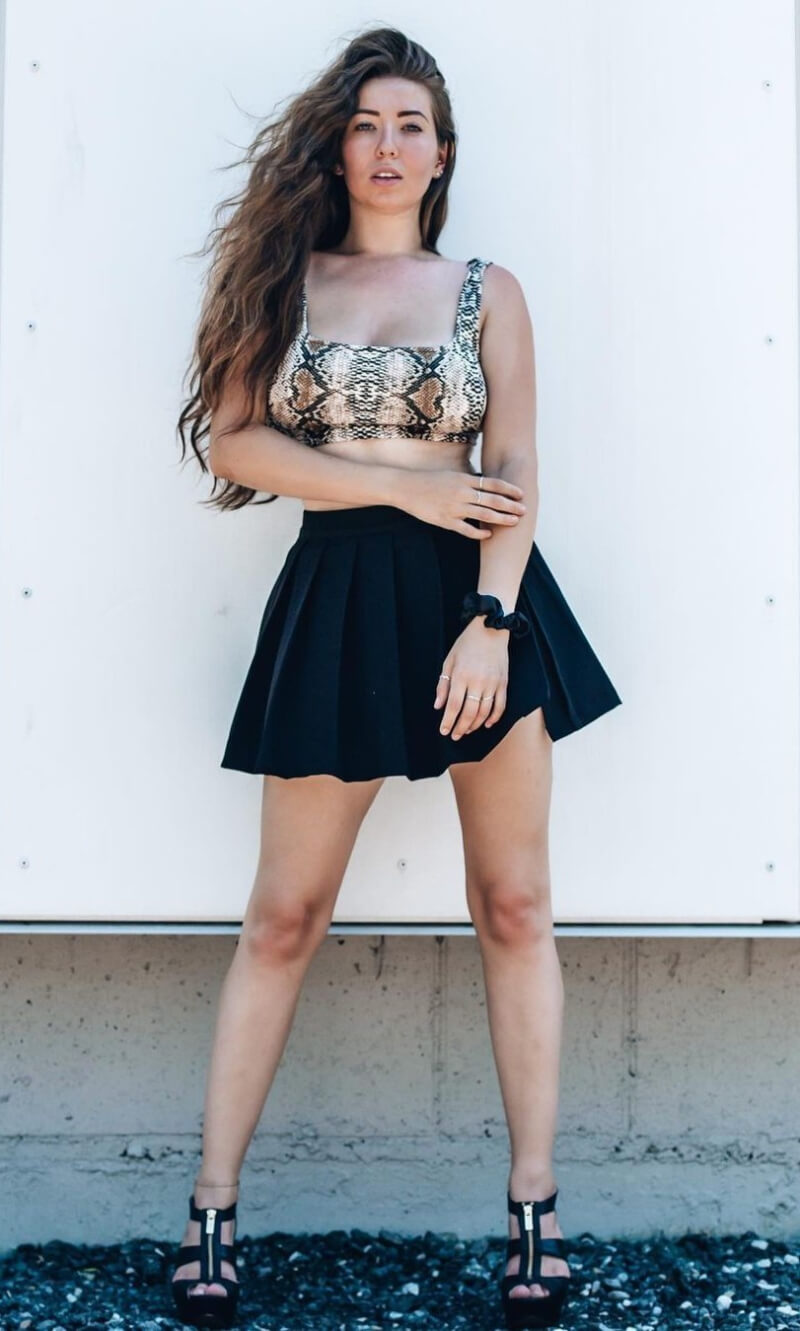 Witness Alanna Pearson’s sizzling style as she rocks a black bralette top with a denim short skirt. This edgy and playful combination showcases her confidence and fashion-forward mindset and combines comfort and allure in this captivating outfit.