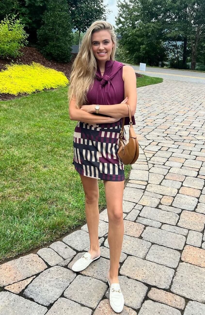 Alexandra O’Laughlin’s green and white golf dress outfit is perfect for the golf course. It is stylish, and comfortable, and will keep you looking and feeling your best while you practice your swing.