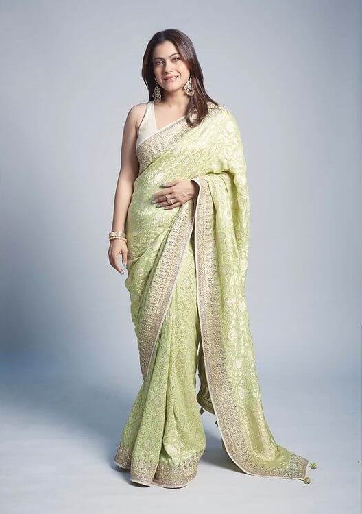 Outfit by Anita Dongre, if you are looking for new designs you will try Anita Dongre. Kajol wears her saree and she looks amazing in this saree. She wears a green saree which has a golden print and borders or a white cut sleeve blouse. You can carry this green saree like this or you can make your style to pair with this saree.