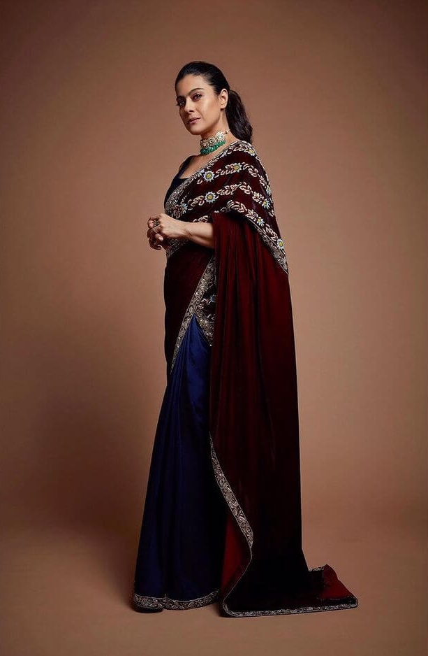 Kajol in red and blue embroidery saree, which have on top beautiful leave and Floral embroidery that gives this saree more elegance and aesthetic look. You can style with this saree choker and for hairstyle ponytail and then you are good to go for events and functions, no one can put off eyes on you with this look and saree.