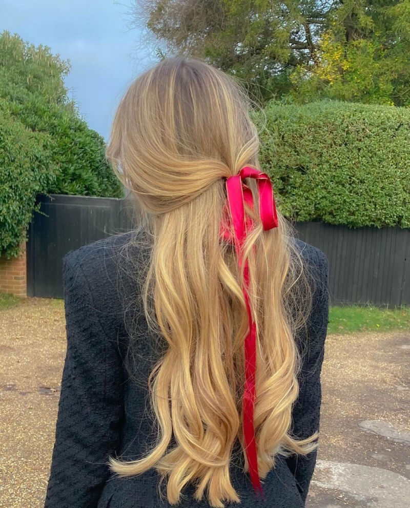 Embrace a touch of whimsy with a loose half of hair pony styled with a ribbon, adding a playful and charming element to your everyday look.