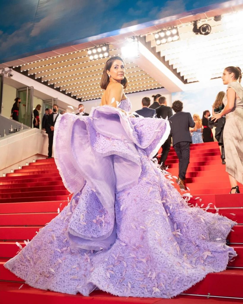 <p>All the fashion drama in the world is sitting here on this beautiful Sophie Couture Lavender Strapless Gown. All layers of oomph came together to create an asymmetric hem with embroidered flowers, with feathers sticking around. Hina Khan looked gorgeous in silver stilettos and earrings.</p>