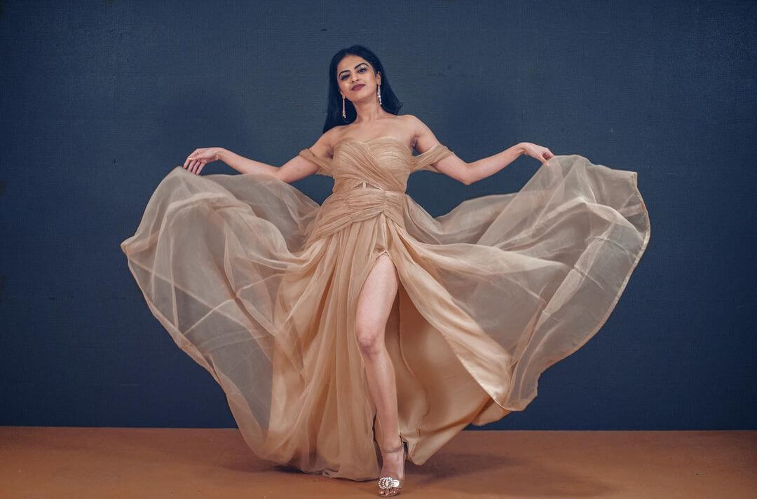 Roshni Sahota Gorgeous Look In Brown Net High Slit Dress
